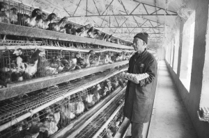右图 沈丘县刘湾镇朱李庄村宏伟种植专业合作社投入200多万元,采取“合作社+基地+农户”的方式从事蛋鸡养殖,蛋鸡存栏5000多只,促进了群众增收。图为养殖场工人在收获鲜鸡蛋。