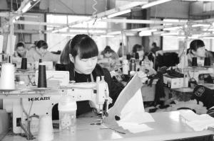 上图 为促进经济社会快速发展,项城市以产业集聚区为平台,采取重组、联合、嫁接、兼并等方式促进产业聚集,使产业集群态势逐步显现,形成了医药、食品、服装等主导产业,吸纳了数万名劳动力就近打工。图为12月3日项城市圣书缘服装公司生产车间内工人正在紧张加工服装。 张永久 摄