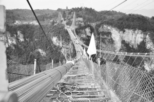 张家界大峡谷玻璃桥成功合龙 12月3日,随着最后一片重达41吨加劲梁的精准吊装,湖南张家界大峡谷玻璃桥钢箱梁成功合龙。据悉,张家界大峡谷玻璃桥总长430米、宽6米,桥面距离谷底相对高度约300米。桥面全部采用透明玻璃铺设,最大游客容量为800人。新华社发