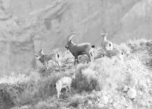 新疆天山南部出现多群野生北山羊 11月22日,几只野生北山羊在新疆阿克苏地区温宿县托木尔峰自然保护区内觅食。近年来,位于天山南部的新疆阿克苏地区采取多种措施保护野生北山羊,使野生北山羊的生存环境得以明显改善,种群数量明显上升。新华社发