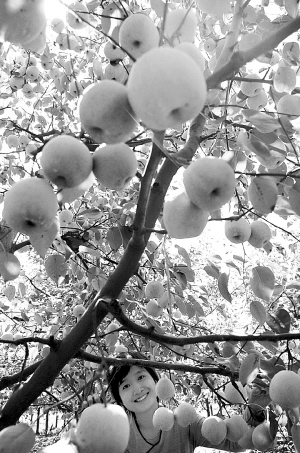 ① 一名游客在河南省宁陵县石桥乡农家梨园采摘水果(2014年9月9日摄)。
