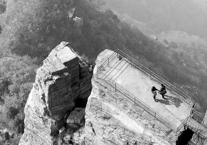 ④两名游客在河南省辉县市境内的太行山绝壁处游览(2013年11月23日摄)。