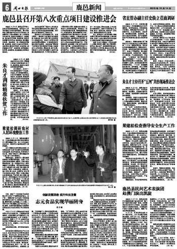 本报讯 12月8日,鹿邑县召开第八次重点项目建设推进会,就商务中心区项目建设工作进行督导推进。周口市委常委、鹿邑县委书记朱良才主持会议。县委副书记、代县长梁建松,县人大常委会主任夏学良,县政协主席郁乐仁,县委常委、县纪委书记孙鹏,县委常委、县政府党组副书记李玉金,县委常委、常务副县长陈涛,县委常委、县人武部政委王鹏程,县委常委、县委办公室主任李国际,县委常委、副县长李建华,县委常委、组织部部长付吉广,县委常委、宣传部部长张丽娟,县委常委、统战部部长宋涛等出席会议。