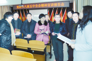 为深入学习贯彻党的十八届五中全会精神,项城市采取各单位主要领导讲党课或邀请省市宣讲团作专题报告的形式,积极开展一系列宣讲活动,迅速在全市掀起了学习全会精神的热潮。图为12月11日项城市花园办事处社区干部正在与宣讲团专家交流学习心得。 张永久 摄