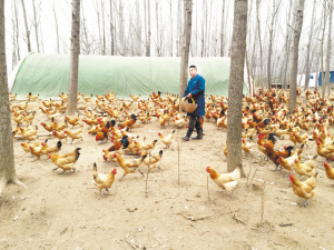近年来,沈丘县因地制宜,引导农民利用丰富的林地资源,大力发展林下养鸡,收到了良好的经济效益。图为新安集乡土鸡养殖户王长喜正在给土鸡喂食。王祥宇 摄