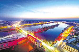 图为华灯初上的沈丘槐店闸区流光溢彩。该闸从右至左依次是深孔节制闸、潜孔节制闸、船闸。闸区中间建有公园和水电站,船闸一侧的小岛成为居民休闲娱乐的好去处。