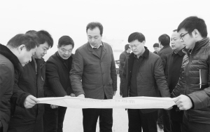 1月4日,县领导和相关部门负责人对老子文化产业园区和中心城区重点项目进行了集中观摩。图为鹿邑县委书记朱良才(左四),县委副书记、代县长梁建松(右三),县人大常委会主任夏学良(左三)在老子文化产业园区现场办公,查看路网规划图纸。闫子健 摄