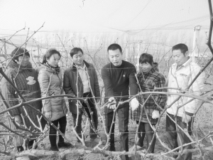 1月10日,商水县邓城镇大学生村官张耀正在向该镇葡萄种植户传授葡萄冬剪技术。张耀在邓城镇党委、镇政府的大力支持和帮助下创建了百亩葡萄园,并将葡萄园作为农民致富培训基地,进行免费培训,并提供果苗、技术、销售服务,帮助农户发展绿色葡萄800多亩。乔连军 摄