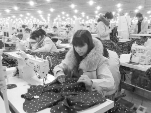 1月12日,商水县舒庄乡农民工在阿尔本制衣厂生产一线。该乡通过乡企合作的形式与10家企业签订技术培训、用工合同,使1200多名农村妇女家门口就业。乔连军 摄
