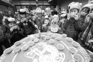 粥香飘腊八 1月17日,一名义工(中)在江苏南京玄奘寺为小朋友盛粥。当日是我国传统节日“腊八节”。