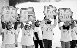 1月17日,在沈阳体育学院白清寨滑雪场,孩子们在活动中打出标语。当日,以“体验、快乐、探索”为主题的“2016世界雪日暨国际儿童滑雪节”活动拉开帷幕。