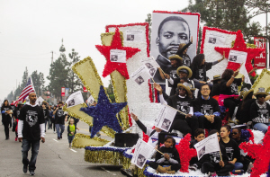 洛杉矶举行马丁·路德·金纪念日游行 1月18日,在美国洛杉矶,人们参加马丁·路德·金纪念日游行。1986年起,美国政府将每年1月第三个星期一定为马丁·路德·金全国纪念日。新华社发
