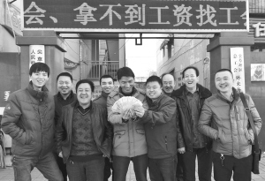 1月26日,在太原市尖草坪区总工会外来务工人员服务中心门口,拿到工资的农民工合影留念。