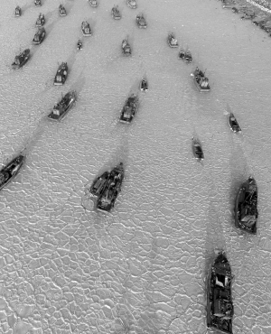 1月26日,在山东省烟台市芝罘岛西口村渔码头,渔船冻在海冰中。
