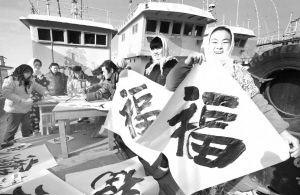 送春联到船头 1月27日,在江苏省连云港市高公岛渔港的渔船上,渔家大嫂刘金艳领到书法家免费书写的春节“福”字。当日,江苏省连云港市连云区组织书法家来到当地高公岛渔港的渔船上,为渔民们现场书写春联。书法家现场挥毫泼墨,把新春的美好祝愿带给渔民。新华社发