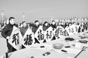 1月27日,周口市2016年文化、科技、卫生“三下乡”活动在商水县舒庄乡扶苏村举行启动仪式。当天,书法家们挥毫写“福”,写好的“福”字很快被当地群众“抢夺一空”。记者 岳建辉 摄