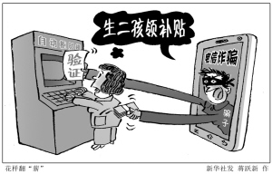 云南省曲靖市公安局最近就破获了一起以“生二孩领取国家补贴”为由的诈骗案。骗子称刚生完二胎的家庭可以领计生补贴但要到自动柜员机上进行验证,受害人按照提示“验证”后即被骗数千元。此外,还出现了二维码等诈骗方式,受害人一旦扫描了二维码,手机就会被植入木马病毒。 新华社发
