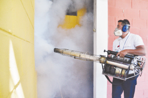 2月3日,在萨尔瓦多首都圣萨尔瓦多,一名男子进行烟熏灭蚊。新华社发