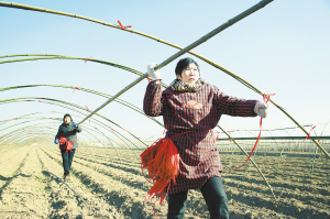 春节临近,扶沟县柴岗乡妇女正认真搭建蔬菜拱棚。近年来,扶沟县蔬菜产业发展势头迅猛。截至目前,全县瓜菜种植面积达52万亩,其中,保护地栽培面积18万亩,总产量310万吨,总产值46.8亿元。张力友 摄