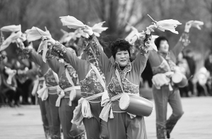 2月19日,山东省邹平县韩店镇崔韩村农民在表演腰鼓。