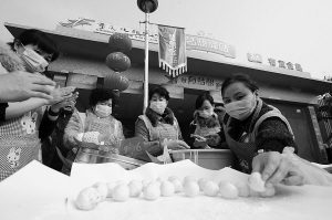 2月19日,志愿者在重庆火车北站南广场元宵节主题活动现场做汤圆。