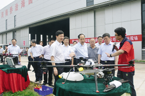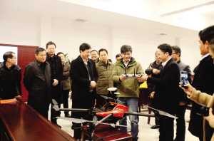 极飞科技无人机企业负责人向县领导讲解演示他们生产的无人机