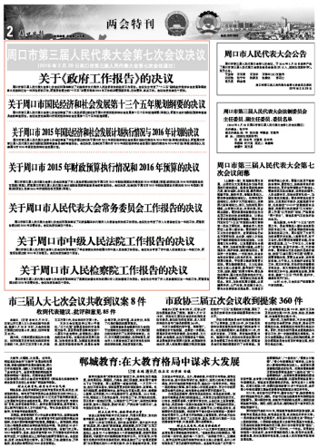 周口市第三届人民代表大会第七次会议审查了市人民政府提出的《关于周口市国民经济和社会发展第十三个五年规划纲要(草案)》,同意大会计划财政预算审查委员会的审查报告。会议决定批准周口市国民经济和社会发展第十三个五年规划纲要。
