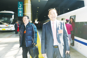 3月2日,出席十二届全国人大四次会议的河南代表团乘坐火车抵达北京西站。这是李士强代表(前右)走上站台。新华社发