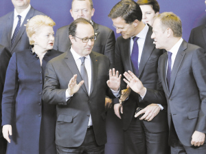 3月17日,在比利时首都布鲁塞尔欧盟总部,立陶宛总统格里包斯凯特、法国总统奥朗德、荷兰首相吕特和欧洲理事会主席图斯克(前排从左至右)交谈。