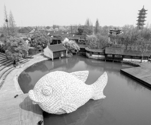 3月27日,粉红色的“浮鱼”首次亮相水乡乌镇西栅景区水剧场。这件作品是“大黄鸭之父”弗洛伦泰因·霍夫曼根据乌镇西栅景区内“水剧场”的空间环境而创作,也是即将开幕的“乌镇国际当代艺术邀请展”的重要参展作品之一。新华社记者 徐昱 摄