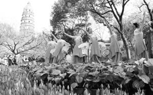 3月26日,演员在苏州虎丘艺术花会上表演江南水乡舞蹈。当日,以“花俏江南,寻梦虎丘”为主题的2016年虎丘艺术花会在苏州市虎丘山风景区开幕,展出郁金香、洋水仙、杜鹃、牡丹、一品红、红掌等60多个品种、约10万盆(株)鲜花。花会将持续至5月8日。新华社发