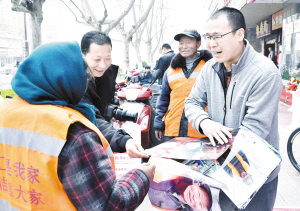 3月26日上午,环卫工人郭百启、冯素英夫妇从两名爱心人士手中高兴地接过自己的照片。3月10日,《周口晚报》报道摄影爱好者王银行(左二)为环卫工人义务拍照的事迹后,迅速在社会上引起巨大反响。淮阳县志愿者协会的陈飞庆(右一)获悉后,立即从淮阳赶来,资助王银行为中心城区环卫工人放大了上百张精美的肖像照片,并亲手送给他们,以表达感激之情。