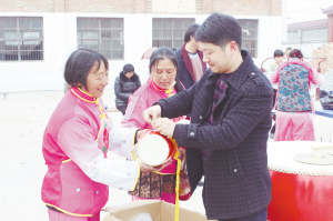 项城市委宣传部驻秣陵镇夏营行政村第一书记朱亚洲以农村文化建设为切入点,积极协调文化部门,争取到腰鼓、大盘鼓、表演服装等20套文娱用品,受到村民的热烈欢迎。这是3月20日送乐器和服装现场。 李光辉 摄