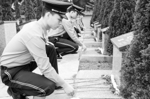 ① 4月1日,在海南省临高县,驻地边防官兵在烈士墓前献花缅怀。