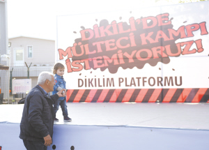 4月3日,在土耳其迪基利,一名孩童从写着“我们不希望在迪基利建难民营”的背景板前经过。 新华社发