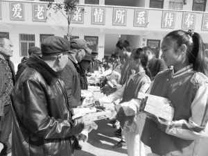 昨日,商水县舒庄乡豫豪中英文学校的学生们来到舒庄乡敬老院,为老人们捐赠牙膏、毛巾等生活用品。据了解,该校学生大都是留守儿童,平时得到了很多来自社会各界的关心和关爱。为了回报社会,该校300多名学生每人自愿捐款1元,为敬老院老人购买生活用品,奉献自己的一份爱心。乔连军 摄