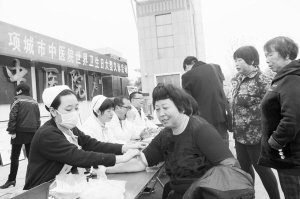 4月7日是世界卫生日,世界卫生组织将今年世界卫生日的关注重点确定为“应对糖尿病”。当天上午,我市卫生部门组织多家医院走上街头,开展大型义诊活动,现场为市民抽血验血,认真解答市民提出的相关问题,并发放糖尿病防治知识等宣传资料,向广大市民倡导健康的生活方式。图为项城市开展义诊活动现场。