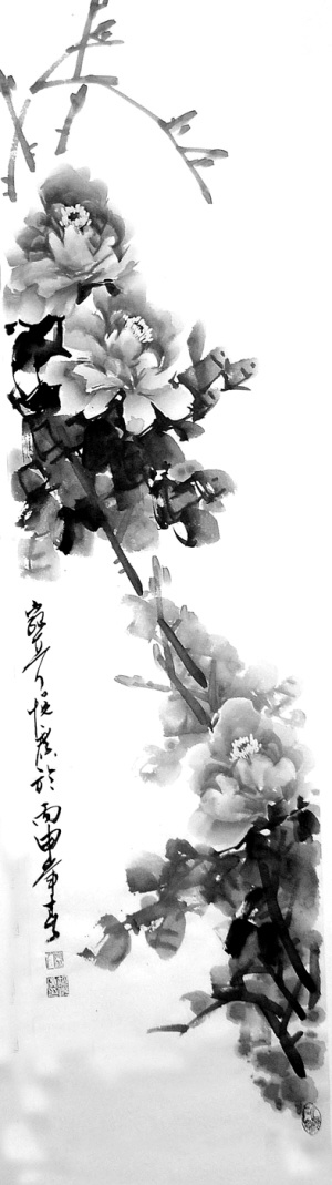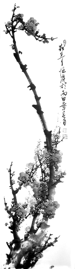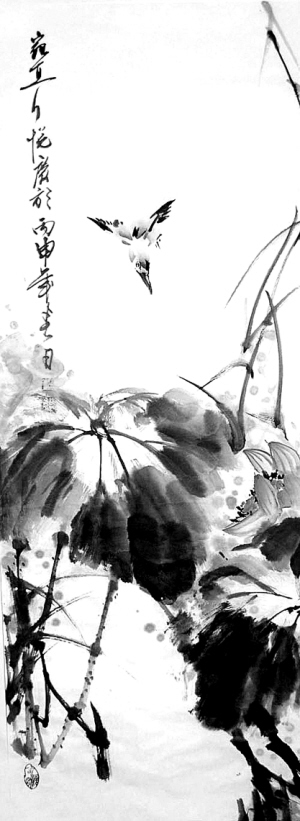 然则观其画作,尚有可悦可点之处。其专攻写意花鸟,又于梅花、牡丹、荷花上颇下工夫,尤其梅荷值得玩味。于梅花者,取其傲霜雪,枝峻峭,花独芳之意;而于荷花者,则因此花为周口市花,又为龙湖之俏,出淤泥而不染洁身自好。窃以为其文人画所寓,大凡如此而已。就艺术品质而言,其梅画法较为娴熟,不论大气中锋,或偶出奇干,花色纷纭,皆能直抒胸臆,给人遐思。其荷画风已得墨荷大写意之功,浓淡有方,聚散得当,再置艳丽花鸟之点缀,足可令人回味无穷,咀嚼津津。