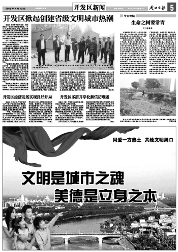 本报讯 走进春天的开发区,到处呈现出一派欣欣向荣的繁荣景象。4月12日,在开元大道上,市政人员正在进行窨井清淤工作,并及时更换损坏的窨井盖,同时对路灯进行检修;而园林工人则正在有条不紊地补栽国槐、黄杨等树木,这是开发区掀起创建省级文明城市热潮的一个缩影。