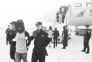 我国首次从非洲大规模押回电信诈骗犯罪嫌疑人 4月13日,在北京首都机场,第二批电信诈骗犯罪嫌疑人被包机押解回国。日前,肯尼亚警方成功打掉一个冒充中国大陆公检法机关、向大陆群众大肆实施电信诈骗的犯罪团伙。肯尼亚执法部门经审查,决定将上述人员中的32名中国大陆犯罪嫌疑人和45名台湾犯罪嫌疑人遣返中国大陆。第一批10名犯罪嫌疑人已于4月9日遣返回国。这是我国首次从非洲大规模押回电信诈骗犯罪嫌疑人。新华社发