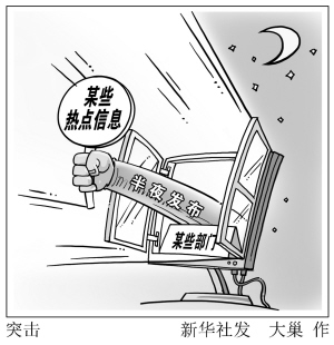 突击 小汽车“限购”政策晚间“空降”,热点新闻事件调查进展发布拖至半夜……近年来,对于公众关注度较高的热点信息,一些部门和地方往往选择在深夜发布,颇有“半夜鸡叫”的味道。当今社会信息传播高度发达。政府通过互联网等平台发布信息,目的就是要充分保障公民的知情权。然而,一些公共政策搞突袭,让民众猝不及防。例如,杭州市曾在晚间出台对小客车采取控制总量和“错峰限行”调整的双重措施,本意是治理拥堵和雾霾,并非坏事,但突然出台的“限牌令”定于发布后的次日凌晨起施行,让不少百姓心里堵得慌。 新华社发
