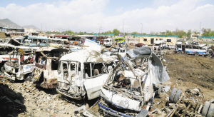 阿富汗爆炸袭击过后 这是4月21日在阿富汗喀布尔拍摄的在爆炸袭击中受损的汽车。阿富汗内政部20日证实,首都喀布尔前一天发生的爆炸袭击已造成64人死亡,另有347人受伤。这是阿富汗塔利班武装12日发动“春季攻势”以来首次对首都目标下手,也是自2011年以来该组织袭击造成伤亡人数最多的一次。 新华社发
