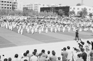 4月22日上午,在热烈、喜庆的气氛中,淮阳县第一届全民运动会精彩开幕,该县82个代表队、3400多名参赛运动员将在未来10多天的竞赛场上充分展现“我参与、我锻炼、我健康、我快乐”的体育精神。 图为开幕式上的文艺表演。