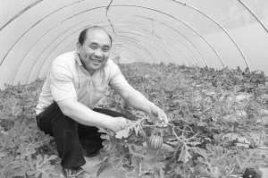 昨日,项城市郑郭镇王楼村村民胡全宏在察看自家西瓜大棚里培育的新品种。近年来,该镇大力调整农业产业结构,积极发展大棚西瓜种植,将大棚西瓜种植作为农民增收的主导产业来发展,引进了安徽等地10多个优质品种,有效提高了农民的收入。