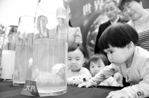 4月22日,姚公社区居民在观看合肥几个水域的水样对比。新华社发