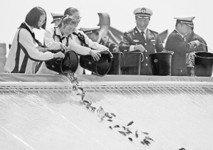 4月22日,人们在上海市松江区石湖荡镇“浦江之首”水域放流鱼苗。新华社发