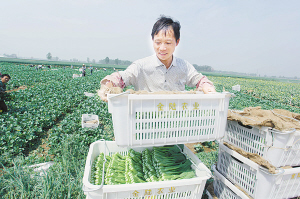 近日,商水县供港蔬菜种植基地陆续进入采摘旺季,大批豆苗、芥蓝和广东菜心等进入收获期。目前,商水县已发展供港蔬菜种植面积3000多亩。据悉,通过建立供港蔬菜快速通道,商水县生产的新鲜供港蔬菜在24小时内即可运抵香港市场,实现了蔬菜基地与香港市场的无缝对接。图为商水县大武乡金陆千亩供港蔬菜种植基地的农民正在田间采摘广东菜心。