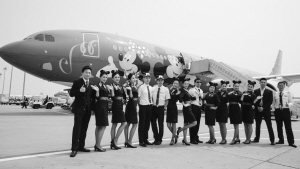 东航首架迪士尼主题彩绘飞机投入运营 4月26日,在北京首都国际机场,东航首架迪士尼飞机的机组成员与飞机合影。据介绍,东航将打造6架迪士尼彩绘飞机,预计2020年前逐步完成喷涂改装并投放市场。新华社发