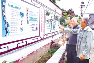 昨日,项城市秣陵镇夏营村村民在观赏文化墙上的“老年养生格言”。为加快新农村建设步伐,近年来,该镇以文化墙为平台,精心营造人文氛围。文化墙上的画卷通俗易懂,向人们传递了新时期和谐、文明的新风尚,丰富了农村文化生活。