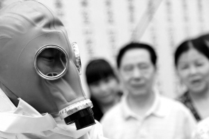 河南省南阳市卧龙区人防办工作人员演示防化流程。